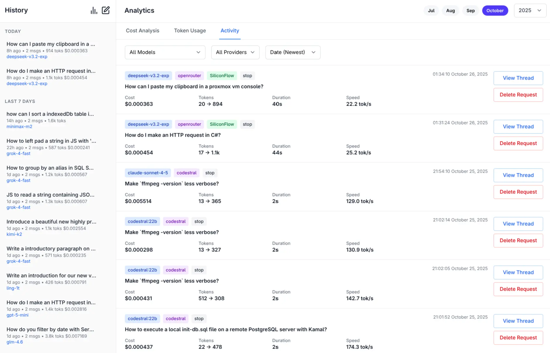 The Activity Log page lets you view the individual requests that make up the daily cost and token usage, the page itself provides a comprehensive and granular overview of all your AI interactions and requests including: Model, Provider, Partial Prompt, Input & Output Tokens, Cost, Response Time, Speed, Date & Time.