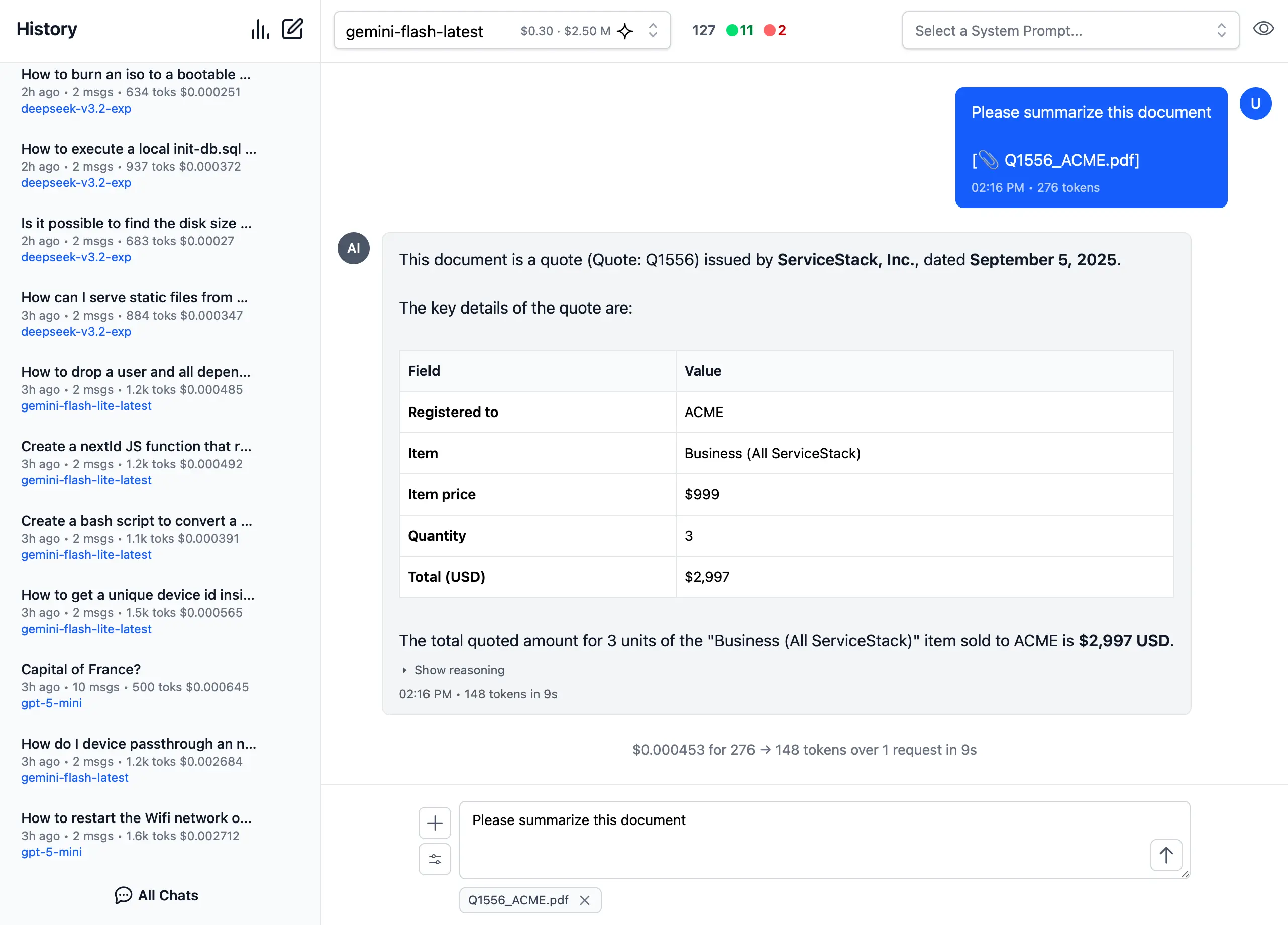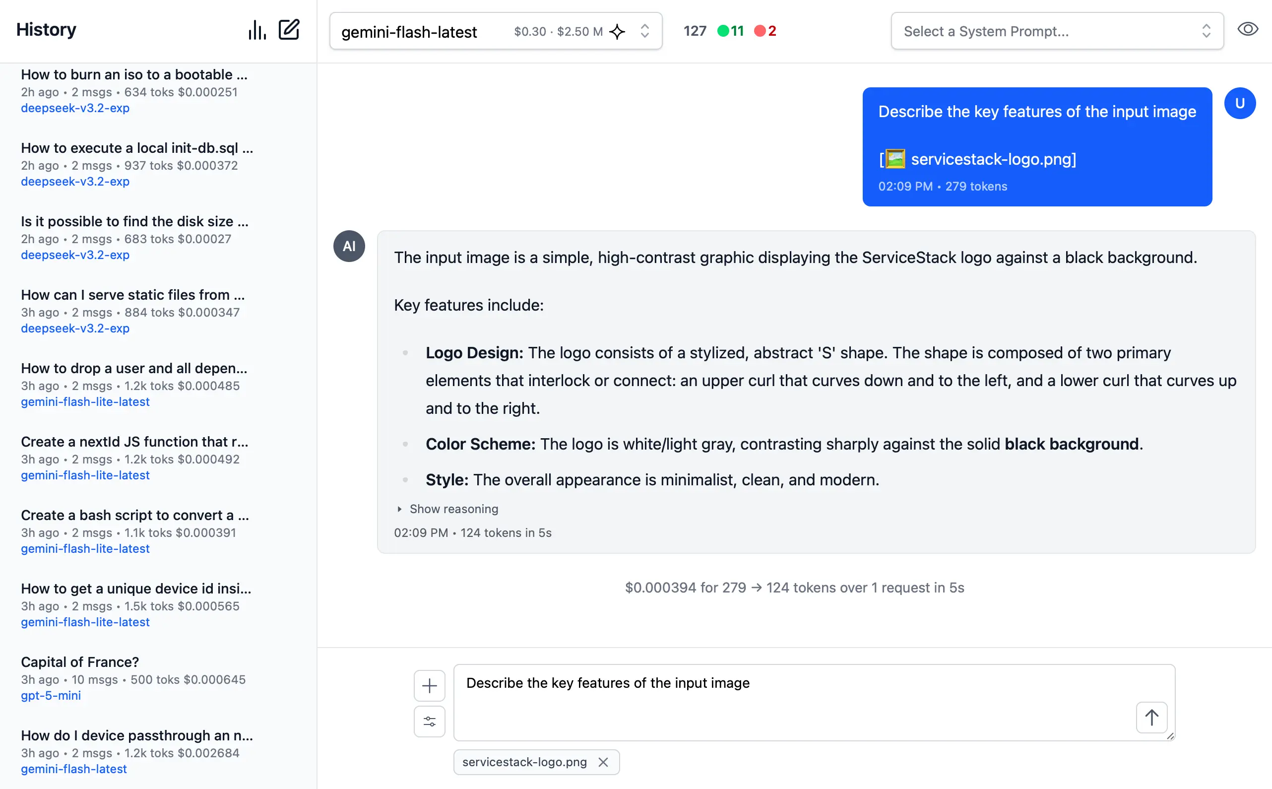 We're happy to announce the next major release of llms.py v2.0.24 now includes API pricing for all premium LLMs, observability with detailed usage and metric insights, so you're better able to analyze and track your spend within the UI.