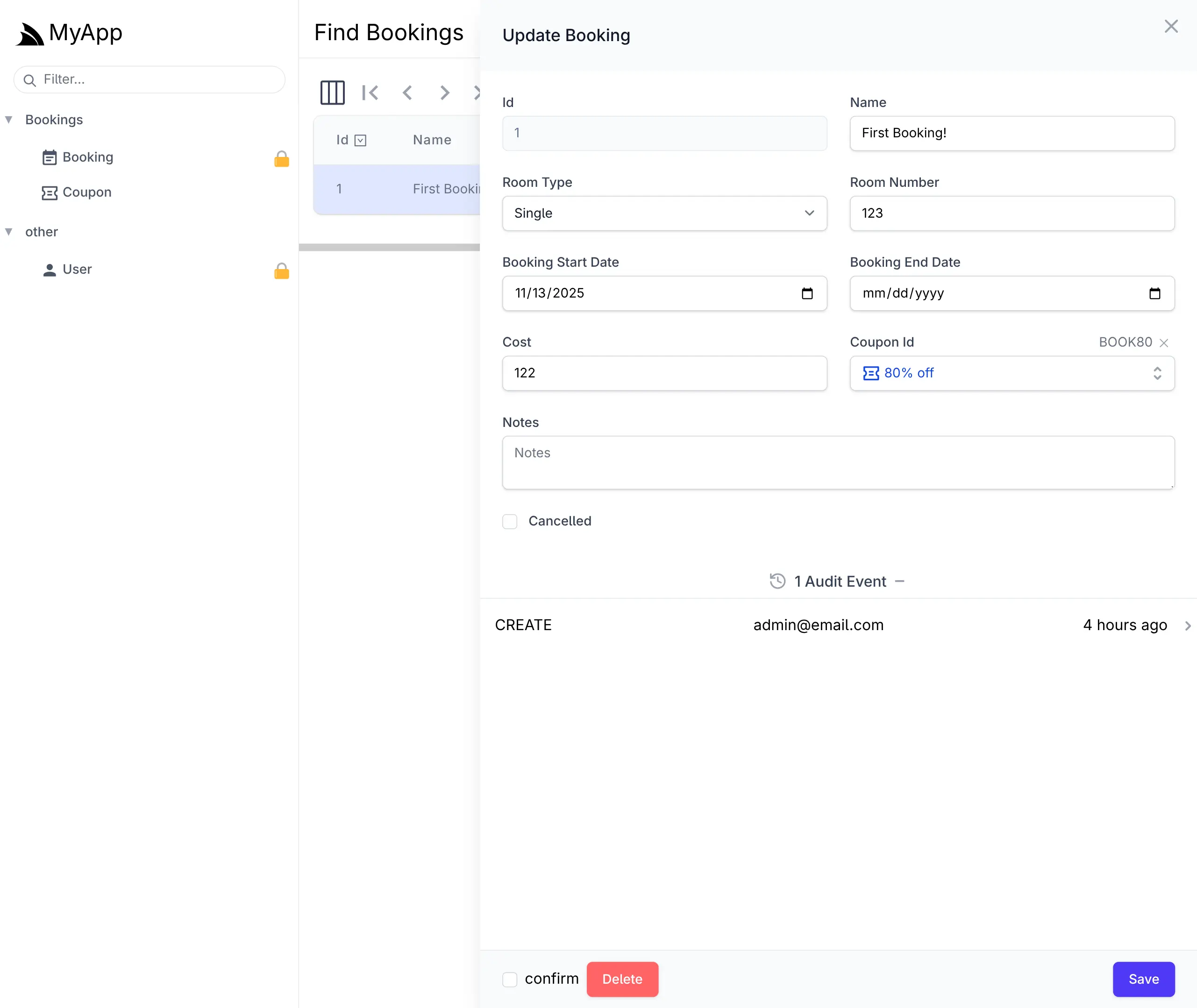 This is enough to generate a complete CRUD UI to manage Bookings in your React App with the React AutoQueryGrid Component. or with ServiceStack's built-in Locode UI: